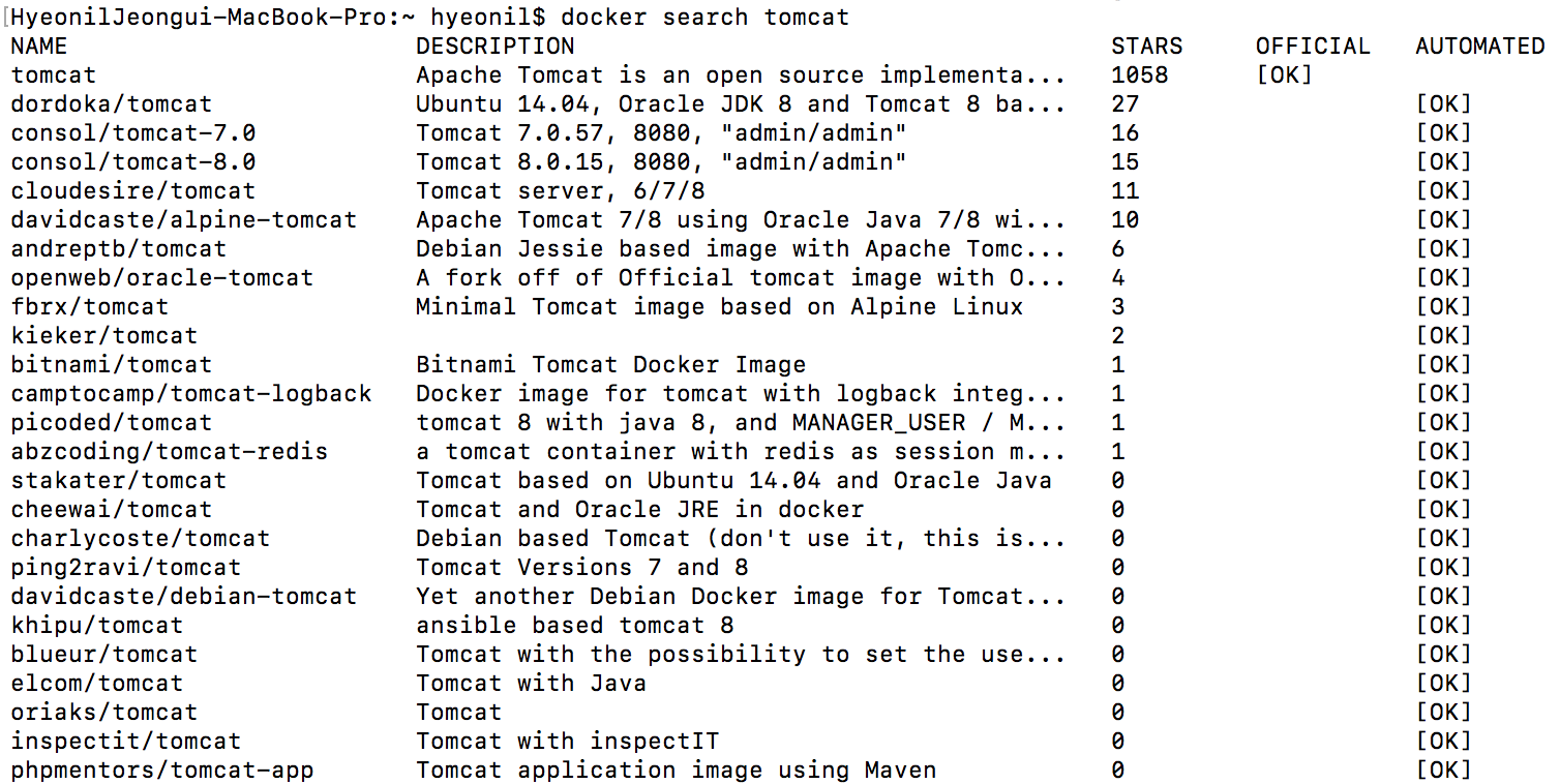 Docker Hub에 공개된 이미지를 검색할 때 사용되는 커맨드다.